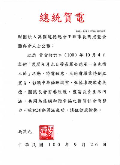 萬國道德總會也進一步說明,「99金色情人節」的制定,不單只是希望年輕人能多多關心長輩,同時也期待銀髮族本身能夠積極的自我肯定,運用歲月累積的理性智慧與寶貴經驗,為自己創造更美好的老年生活。