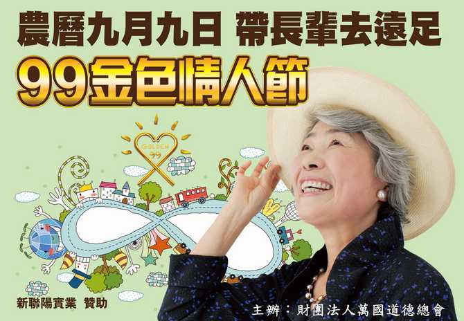 你有多久沒帶家中長輩一起出去走走了?為了凸顯目前台灣社會面臨的老齡化趨勢,同時提倡「自我發展、永續傳承、樂活人生」的健康態度,財團法人萬國道德總會特地將每年農曆九月九日的重陽節,重新定調為「99金色情人節」。